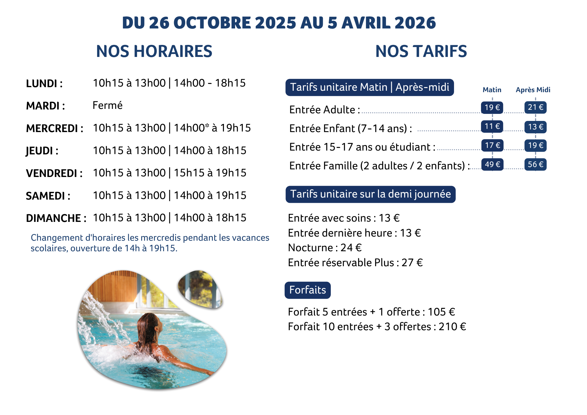 Notre bassin intérieur et extérieur vous proposent des activités ludiques telles que : nage à contre-courant, jacuzzi, jets sous-marins, bains à bulles. Le tout dans une eau thermale naturellement chaude à plus de 33 degrés.
